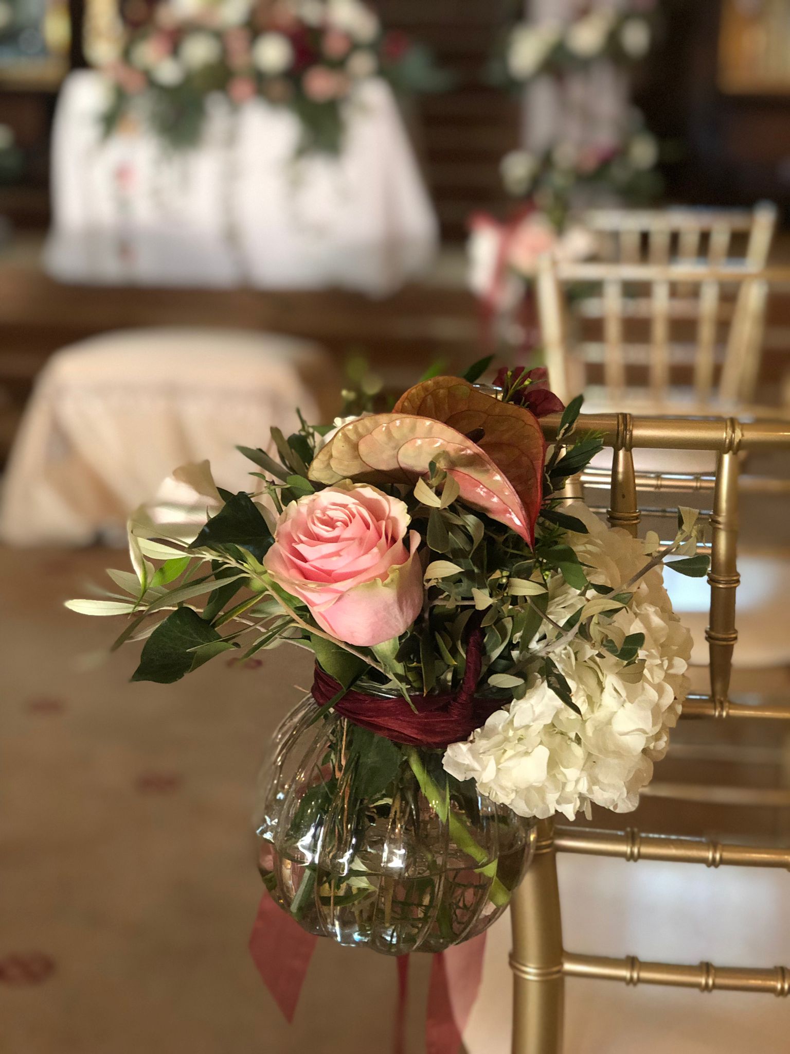 Transformamos el lugar de la ceremonia en un escenario de ensueño, con arreglos que complementan la belleza y solemnidad del momento.