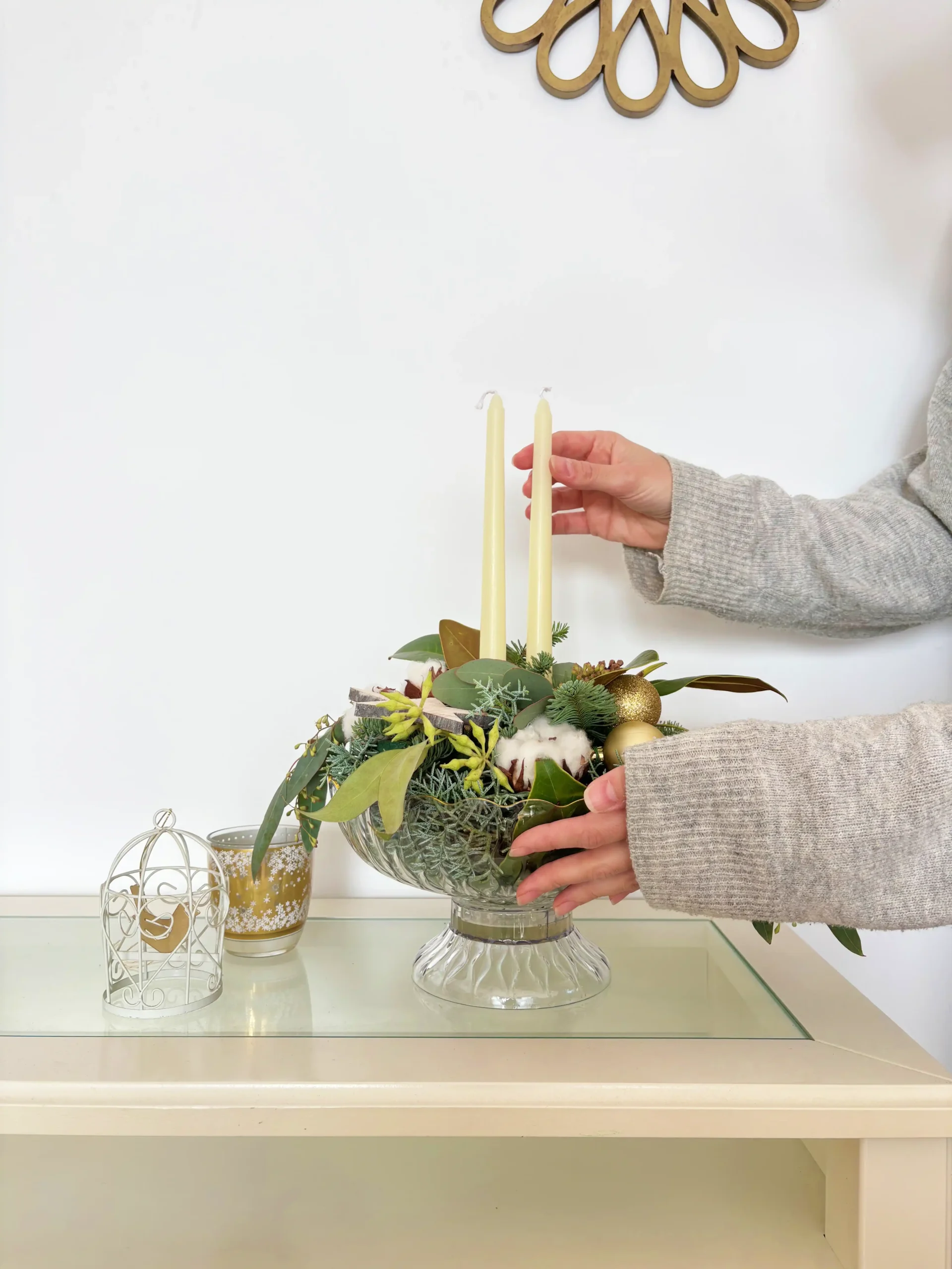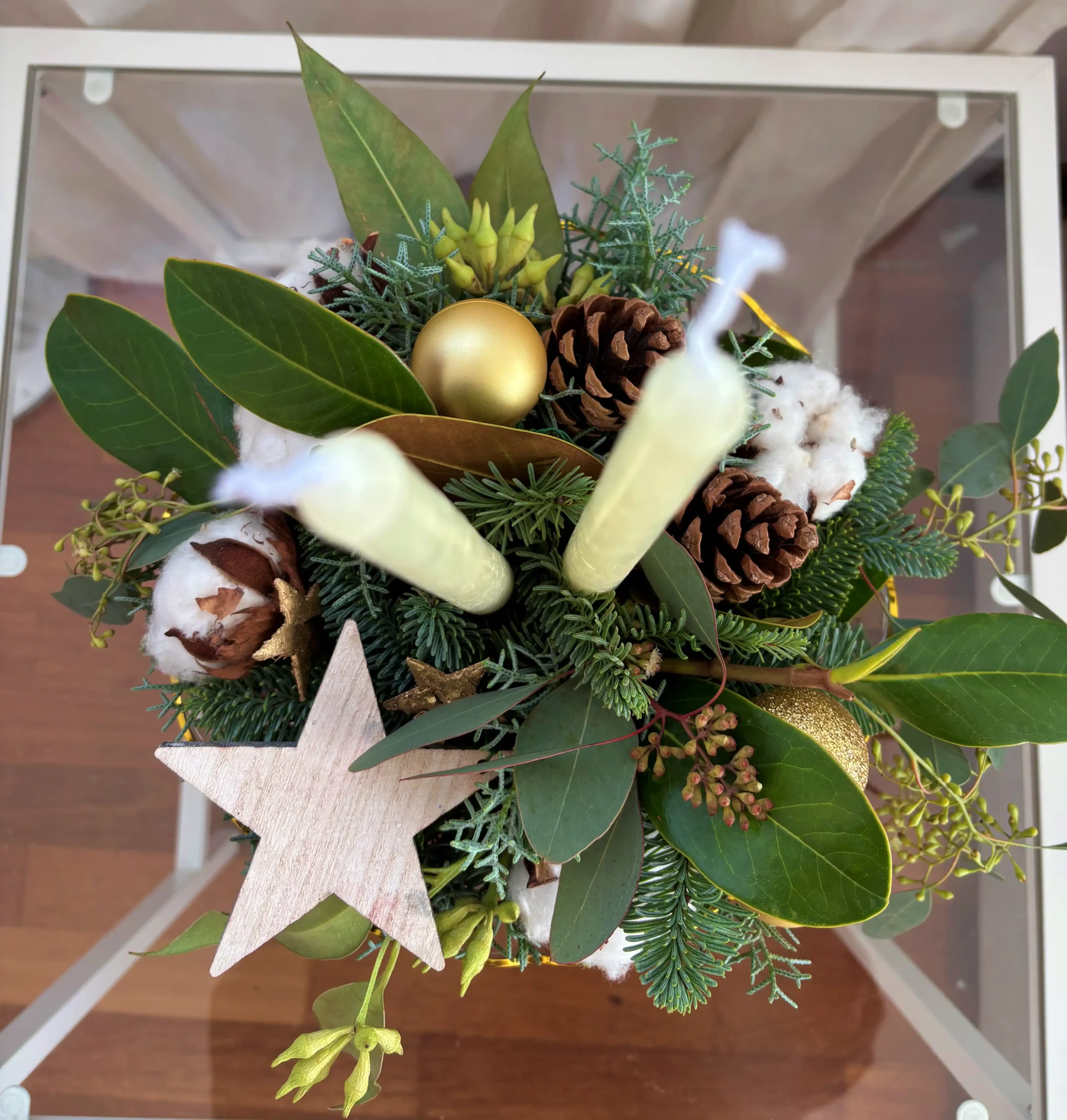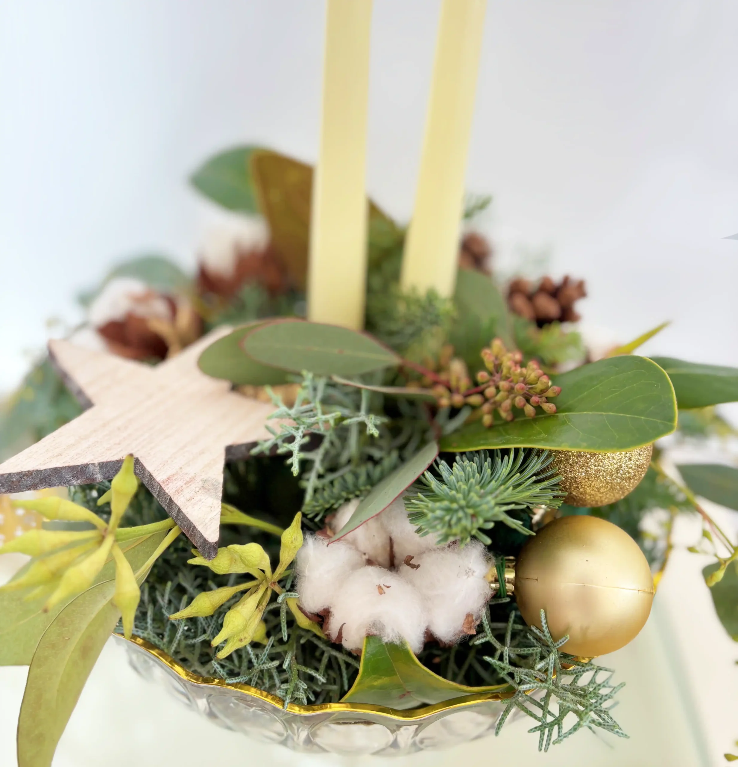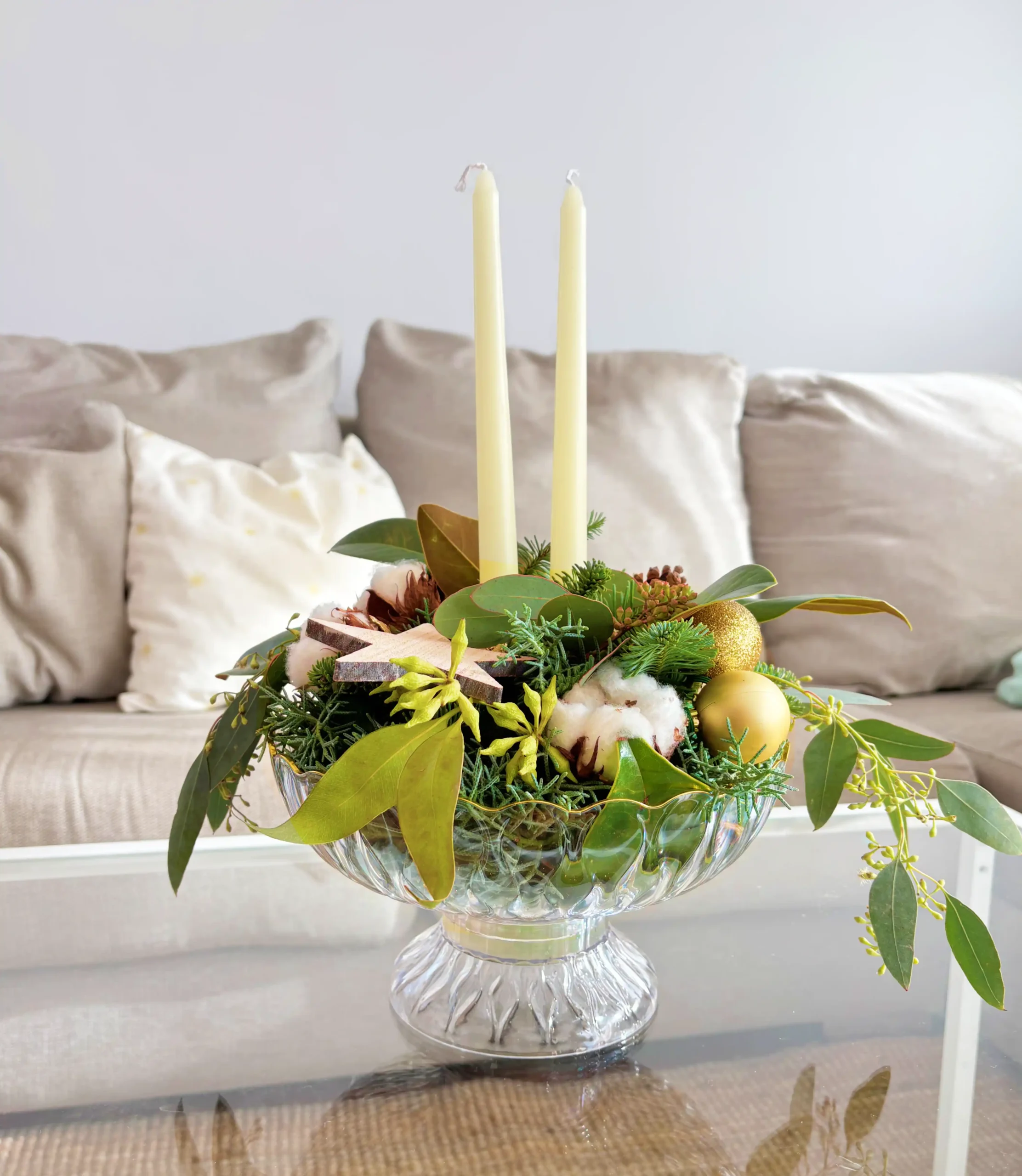 Montado sobre una copa transparente con borde dorado, este centro destaca por su equilibrio entre lo natural y lo brillante: abeto, eucalipto, algodón, estrellitas, bolas doradas y dos velas decorativas que aportan calidez y estilo a cualquier espacio.
