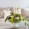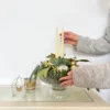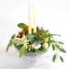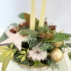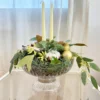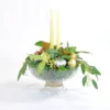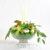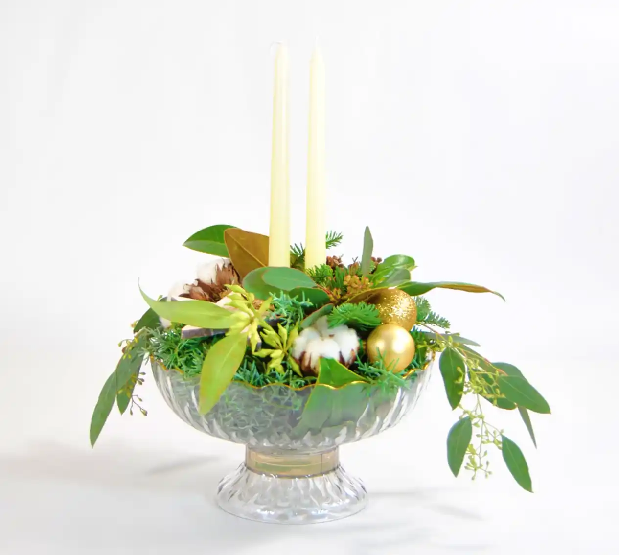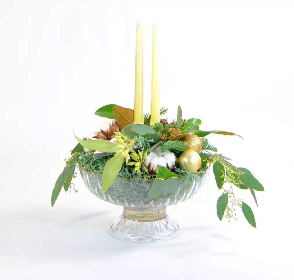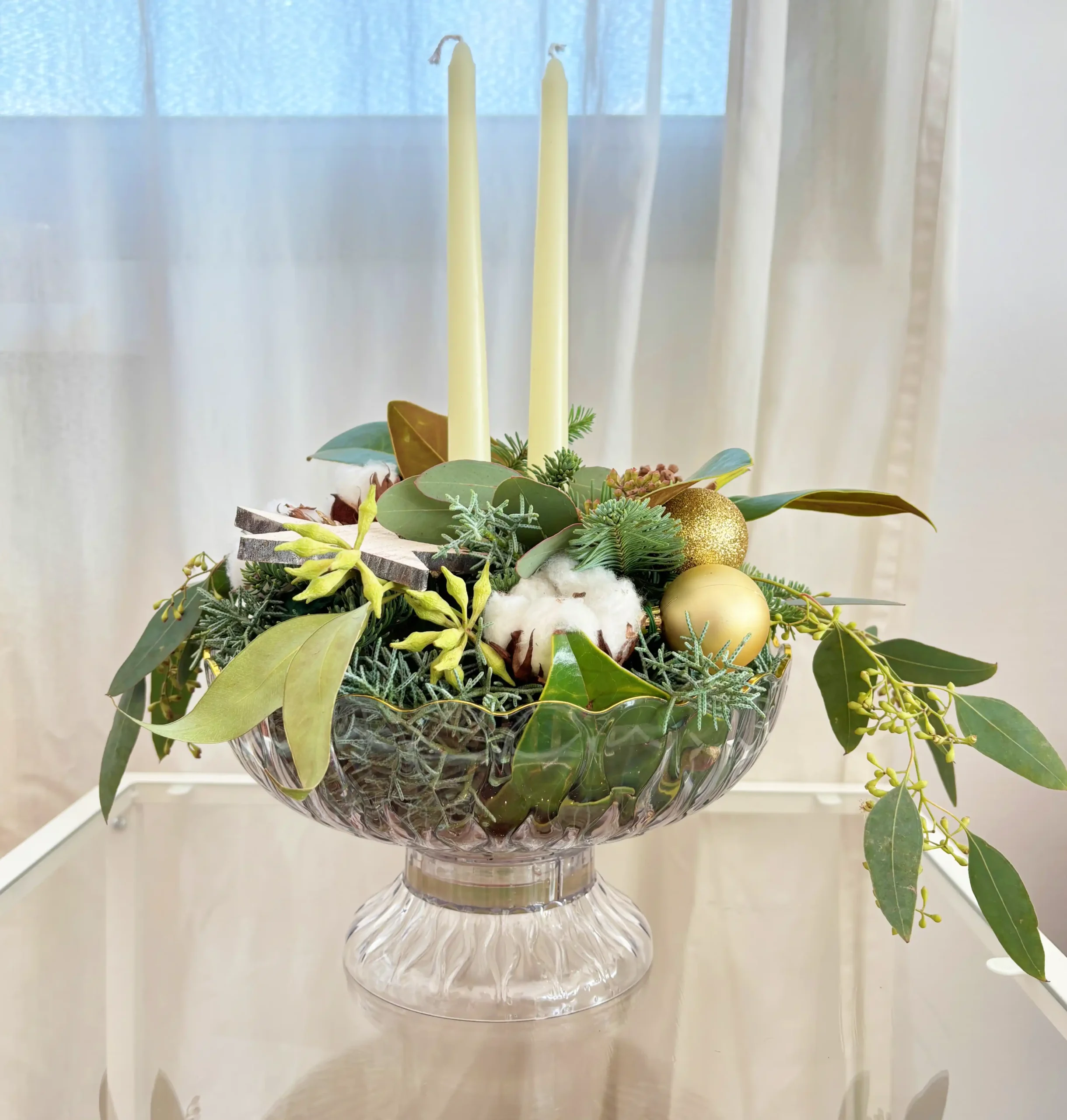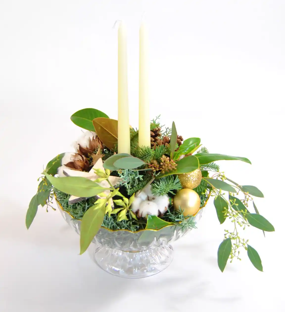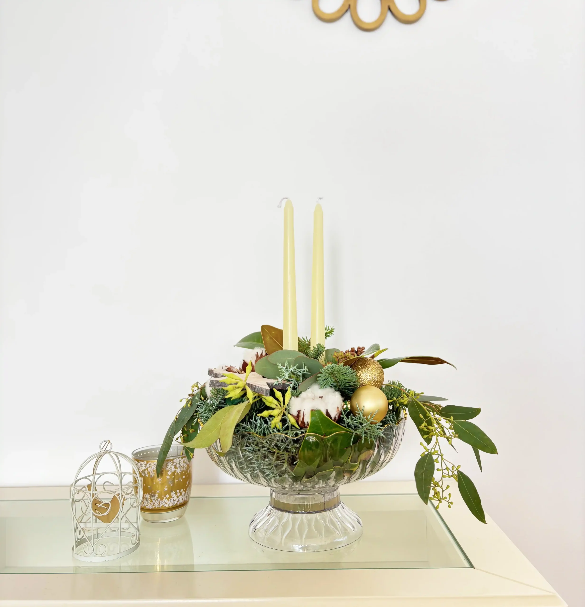 Montado sobre una copa transparente con borde dorado, este centro destaca por su equilibrio entre lo natural y lo brillante: abeto, eucalipto, algodón, estrellitas, bolas doradas y dos velas decorativas que aportan calidez y estilo a cualquier espacio.