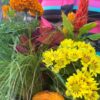 El arreglo incluye crisantemos amarillos, tagetes de color naranja, la singular celosia en espiga anaranjada y hojas de coleus rojizas que aportan contraste. La composición se completa con una elegante hierba ornamental que aporta movimiento y una calabaza decorativa que refuerza el estilo otoñal.