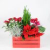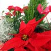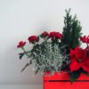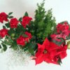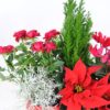 El cyclamen, con sus flores vibrantes, simboliza la sincera amistad y la felicidad duradera, mientras que la ponsetia roja mini es un ícono tradicional de la Navidad, representando la alegría y la celebración. El senecio aporta un toque de verde fresco y natural, complementando el cálido rojo de la ponsetia. Por último, el ciprés se destaca por su forma elegante y su asociación con la longevidad y la inmortalidad, lo que lo convierte en un símbolo apropiado para los buenos deseos de salud y prosperidad para el año nuevo.