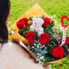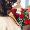 La estrella de las flores, la rosa roja con paniculata. Le hemos añadido un pin de corazón y otro de un osito.