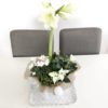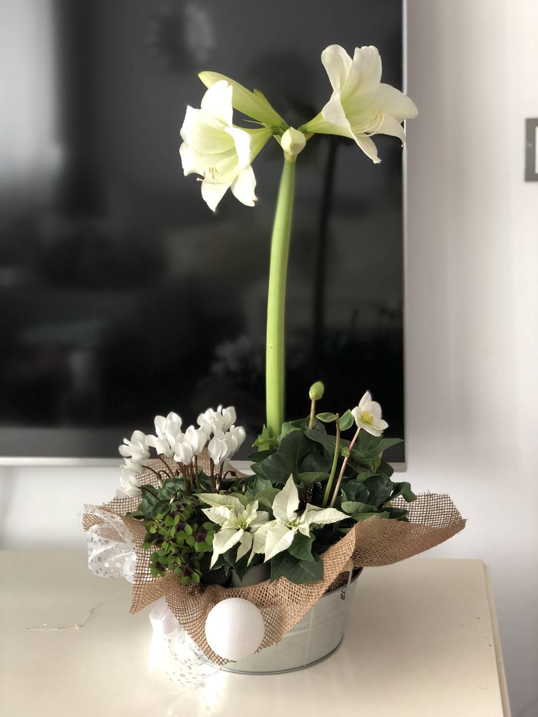 ¿Buscas un centro navideño con estilo y elegancia? No busques más, este es tú centro. Un centro hecho con una base plateada, que contiene: Trébol de la suerte, cyclamen, mini poinsettia blanca, Amarilis, Helleburus(Rosa de navidad)