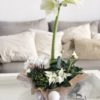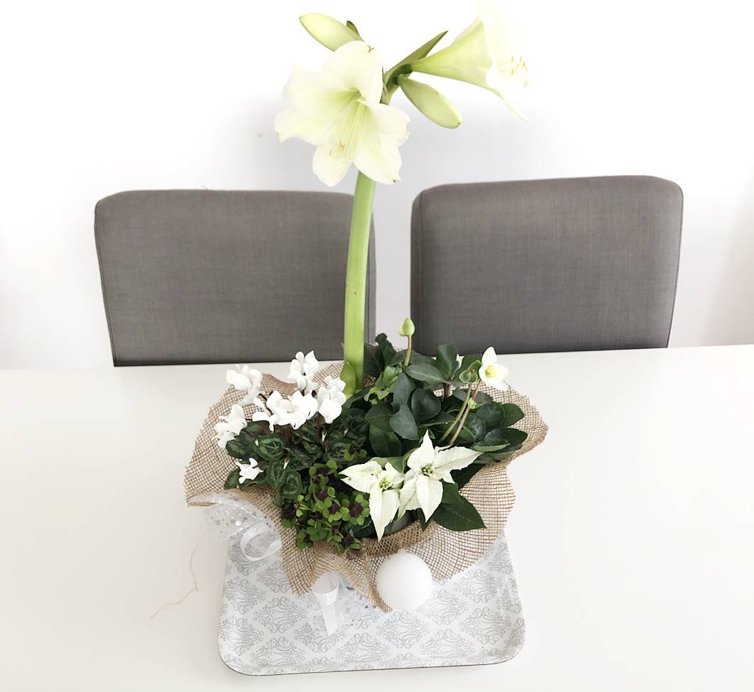 La composición “Feel X-MAS” es una exquisita selección de plantas y flores que captura la esencia de la Navidad con su estilo y elegancia. Este centro navideño, presentado sobre una base plateada, incluye una serie de elementos que encarnan la festividad y la alegría de estas fechas. El trébol de la suerte simboliza buenos deseos y prosperidad, mientras que el cyclamen aporta un toque de color y vida. La mini poinsettia blanca, un clásico de la temporada, agrega un aire tradicional a la composición.