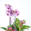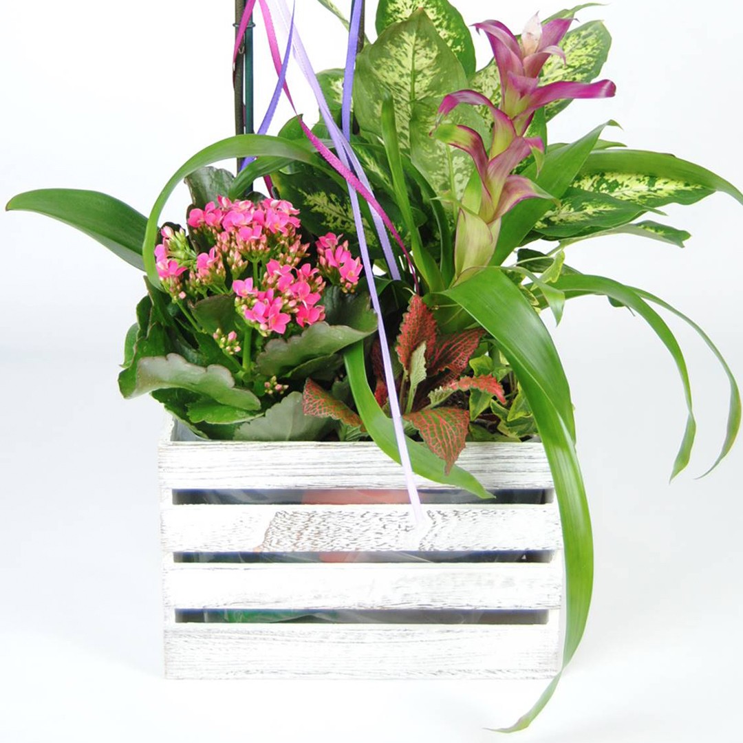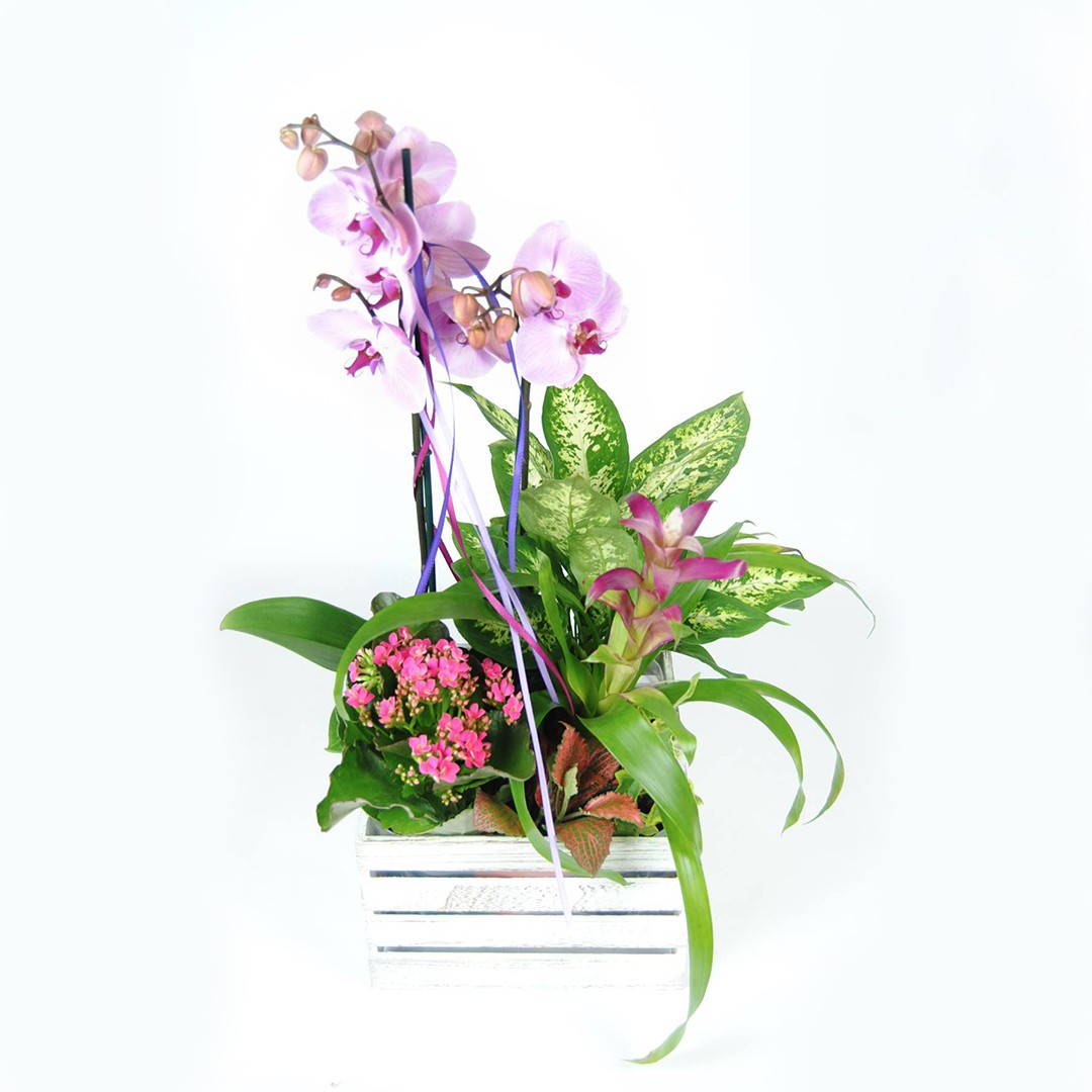 Contiene una orquídea rosa, kalancohe rosa, difembaquia, guzmania fucsia, y un pin decorativo. con sus 70cm de altura y la caja hace 25cmx25cm