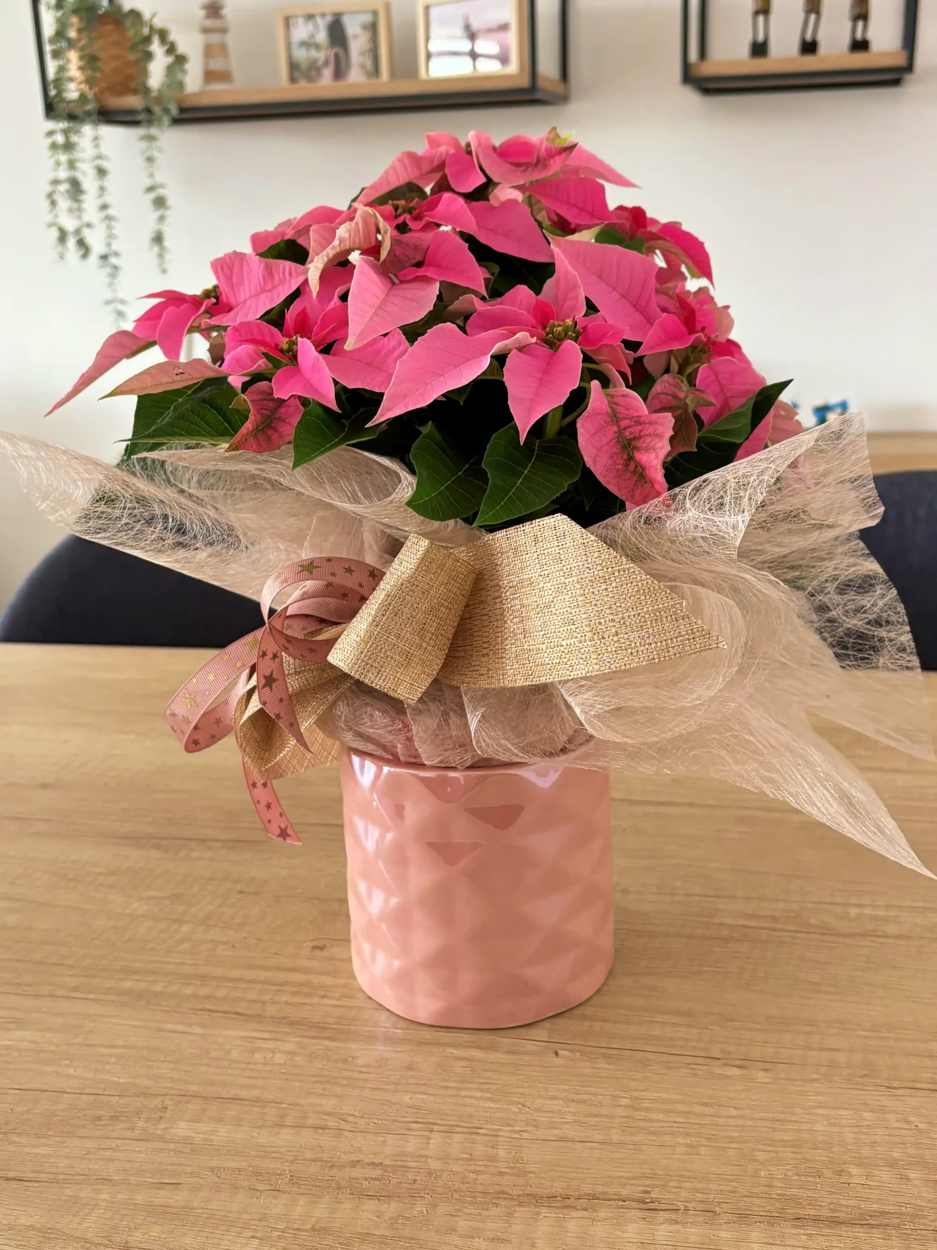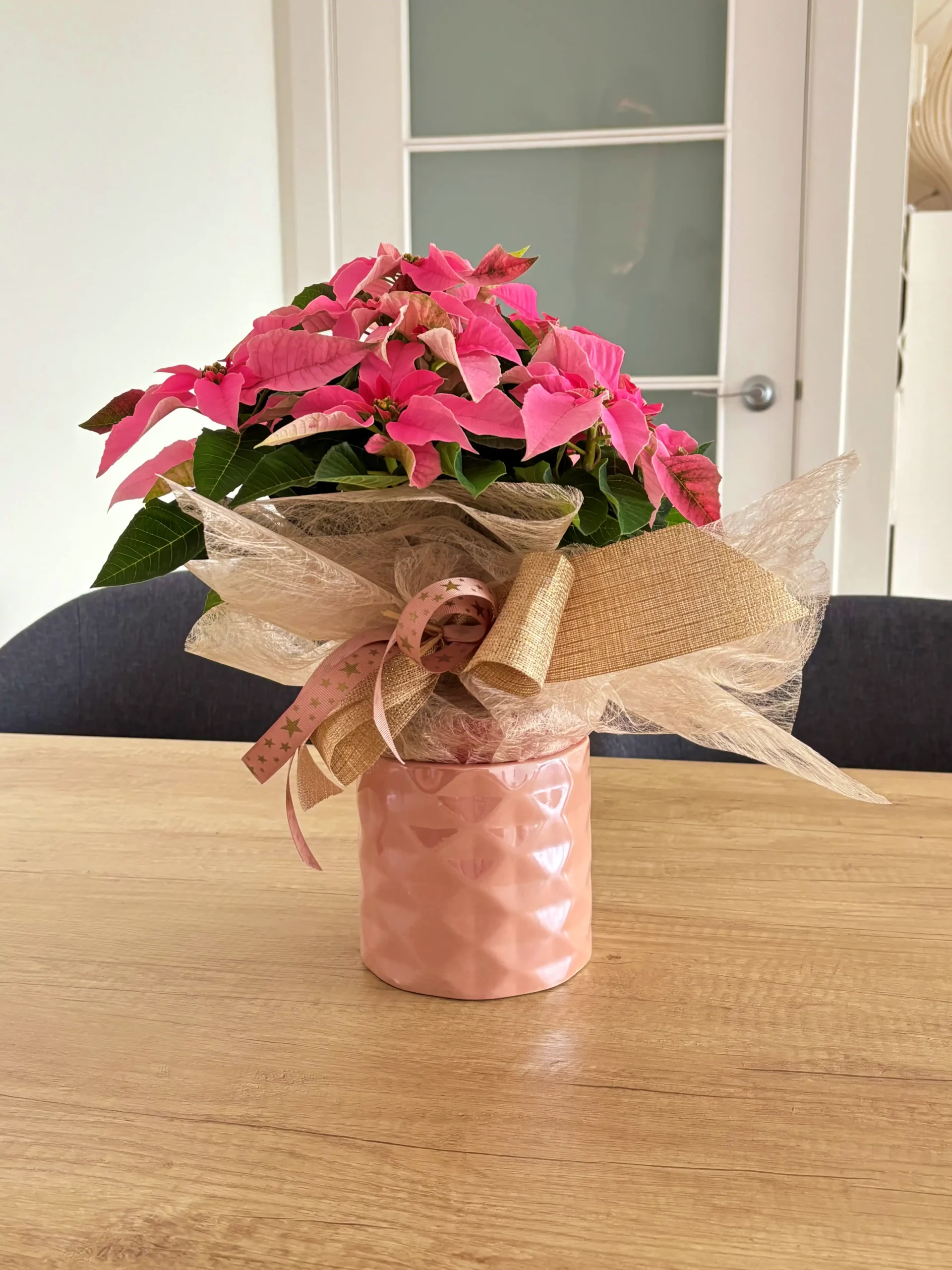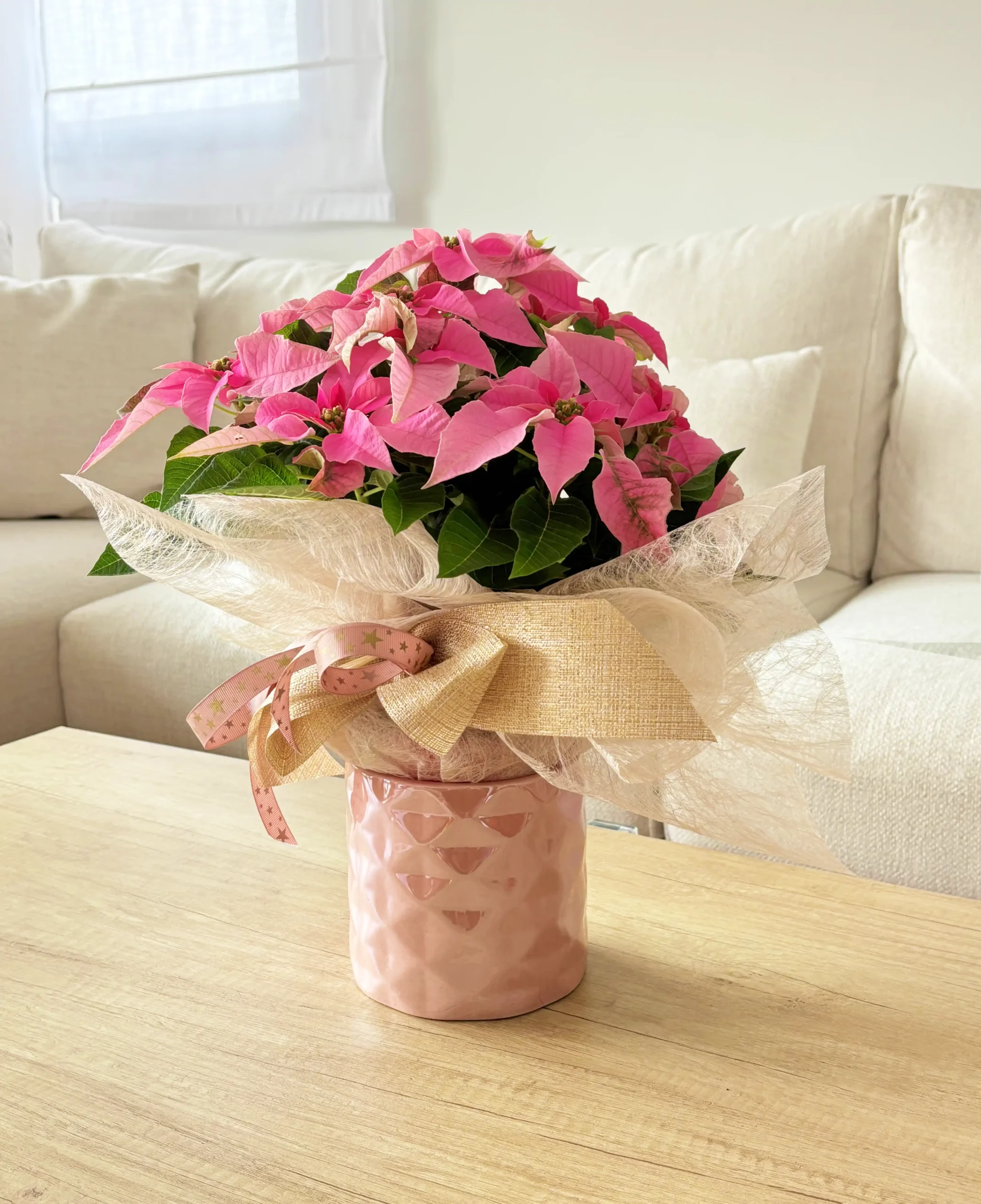 La Ponsetia Pink Christmas es la elección perfecta para quienes buscan una Navidad delicada, moderna y llena de estilo. Sus brácteas rosa intenso aportan calidez y frescura a cualquier espacio, creando un ambiente festivo y acogedor.