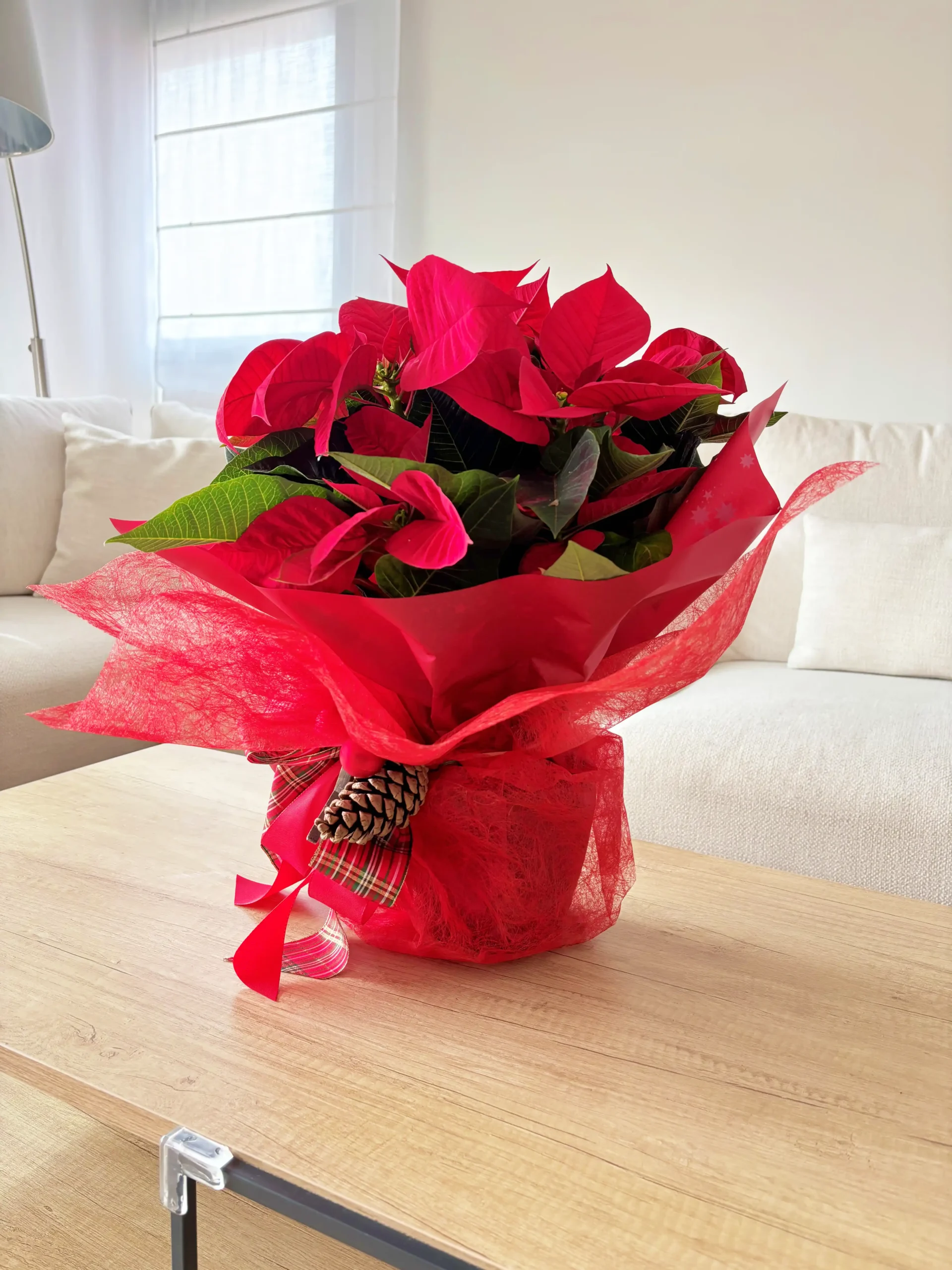 La Ponsetia Roja Premium 50 cm es la opción perfecta para llenar tu hogar de espíritu navideño con una pieza decorativa elegante, sostenible y de gran presencia. Esta ponsetia natural ha sido cultivada de kilómetro 0, lo que garantiza una planta más fresca, resistente y con menor impacto ambiental.