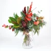 Su mezcla de ilex rojo, eucalipto, abeto, magnolia y roble crea un ramo equilibrado, con aroma fresco y un contraste perfecto entre tonos verdes, dorados y rojos.