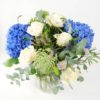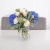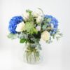 Ramo Elegante azul y blanco que transmite prestigio. Hemos seleccionado cuidadosamente estas flores para que sea un ramo selecto, para transformar un ramo de flores para las personas que quieren regalar frescura y armonía. Seguro que si le regalas este ramo aciertas y dará categoría a cualquier espacio que se quiera colocar.