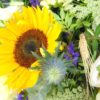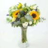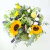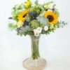 Contiene: 3 fresias amarilla, 2 girasoles, 3 claveles, 2 trachellium, 6 estatice(siempreviva), 2 eryngium, 3 lisiantum y eucalipto extra perfumado