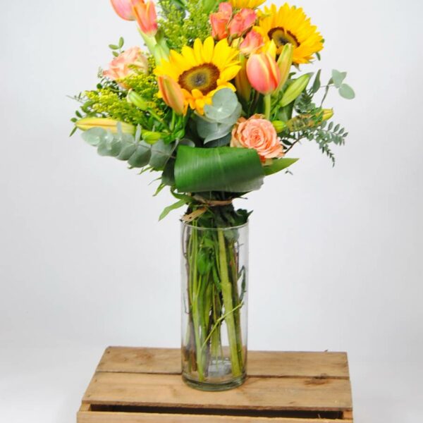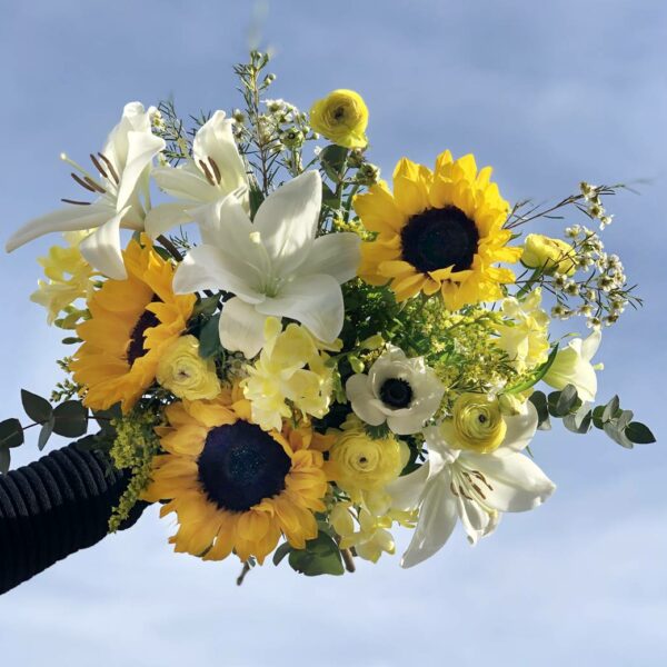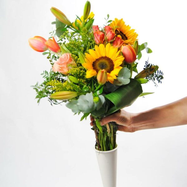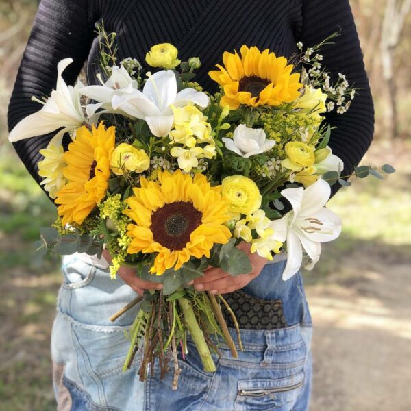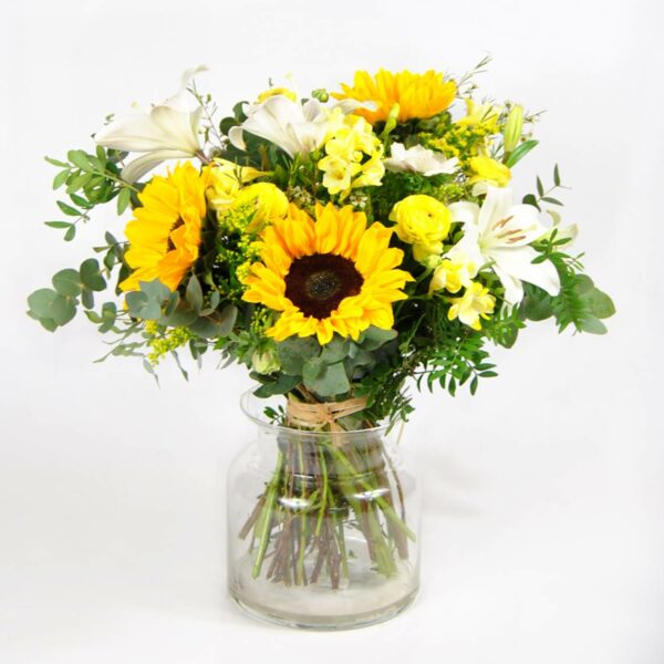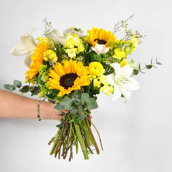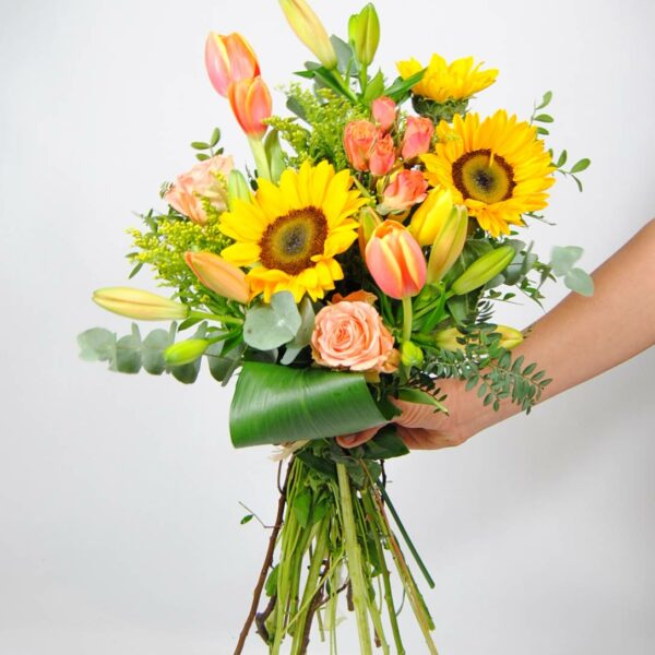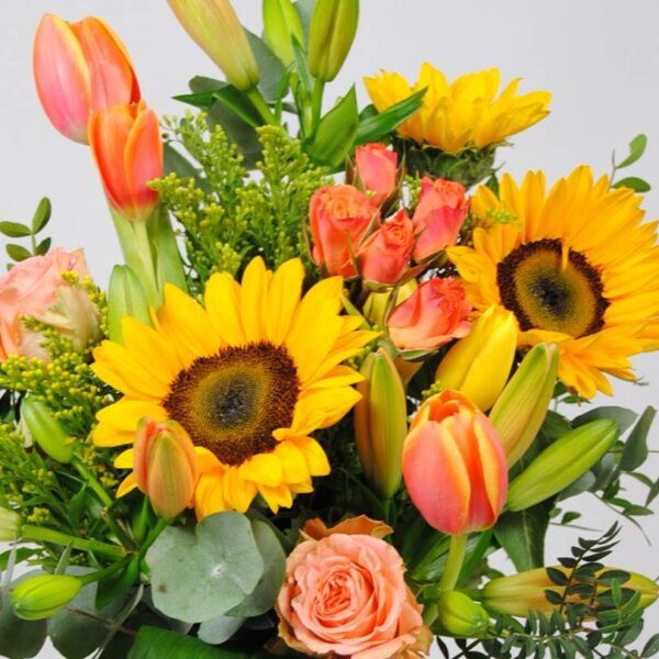 - Combinaciones de girasoles y flores de temporada: Para quienes buscan algo un poco más sofisticado, ofrecemos ramos que combinan girasoles con flores como lirios, rosas y alstroemerias, creando un contraste de colores y texturas que encantará a cualquiera.